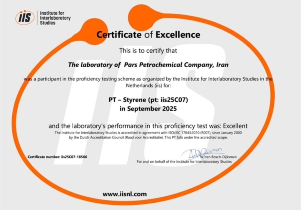 آزمایشگاه شرکت پتروشیمی پارس برای یازدهمین سال متوالی موفق به دریافت گواهی «عملکرد عالی» (Certificate of Excellence) در آزمون مهارت بین‌المللی استایرن منومر (Styrene Monomer) شد؛ آزمونی معتبر که توسط مؤسسه Institute for Interlaboratory Studies (IIS) در کشور هلند برگزار می‌شود.